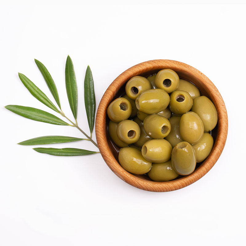 Raccolte verdi da cultivar Chalkidiki, queste olive sono successivamente lavorate con metodo Sivigliano; la loro croccantezza ne permette una facile denocciolatura. Queste olive di grande calibro, e molto saporite, possono impiegarsi in ogni piatto di un tipico pasto della cultura culinaria mediterranea.